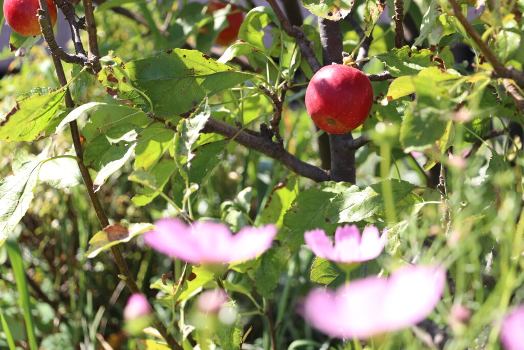 色づいた姫リンゴの木の下で 自己主張することもなくたたずむ姿は 何とも奥ゆかしい限りです。